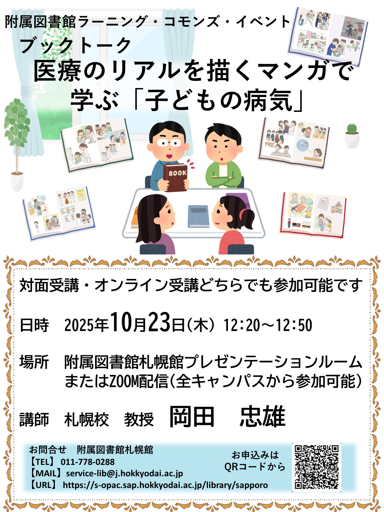 附属図書館では、令和7年10月23日(木)に札幌館プレゼンテーションルームにおいて、ラーニング・コモンズ・イベント『ブックトーク 医療のリアルを描くマンガで学ぶ「子どもの病気」』を開催します。
