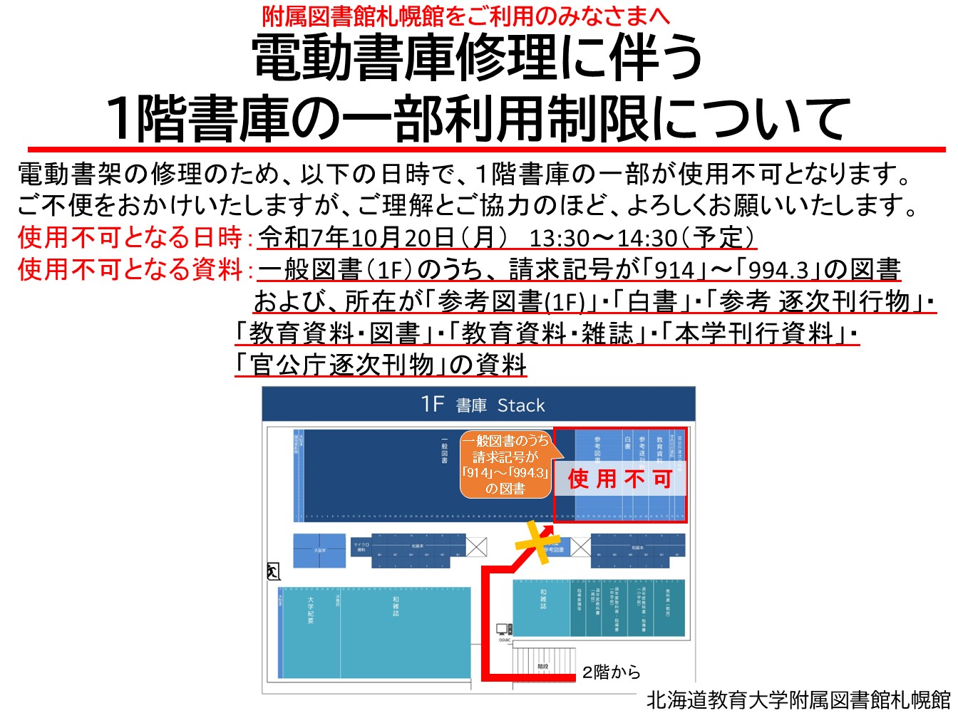 [札幌] 電動書庫修理に伴う1階書庫の一部利用制限について(10/20)