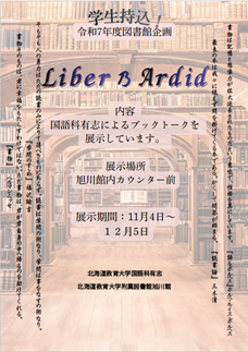 図書館では、学生・院生の皆さんに役立つ企画を開催しています。今回は、国語科有志がオススメの図書を紹介する資料展示で、学生さんたちの持込企画です。 期間:令和7年11月4日(火)~12月5日(金) 場所:図書館内カウンター前の展示コーナー ★ 学生さんたちの持込企画、歓迎します! ★図書館のラーニングコモンズ等の機能を使ってやってみたいことがあったら、ぜひ聞かせてください。図書館がバックアップします。 記事の種類 活動報告 コメントを投稿するにはログインしてください