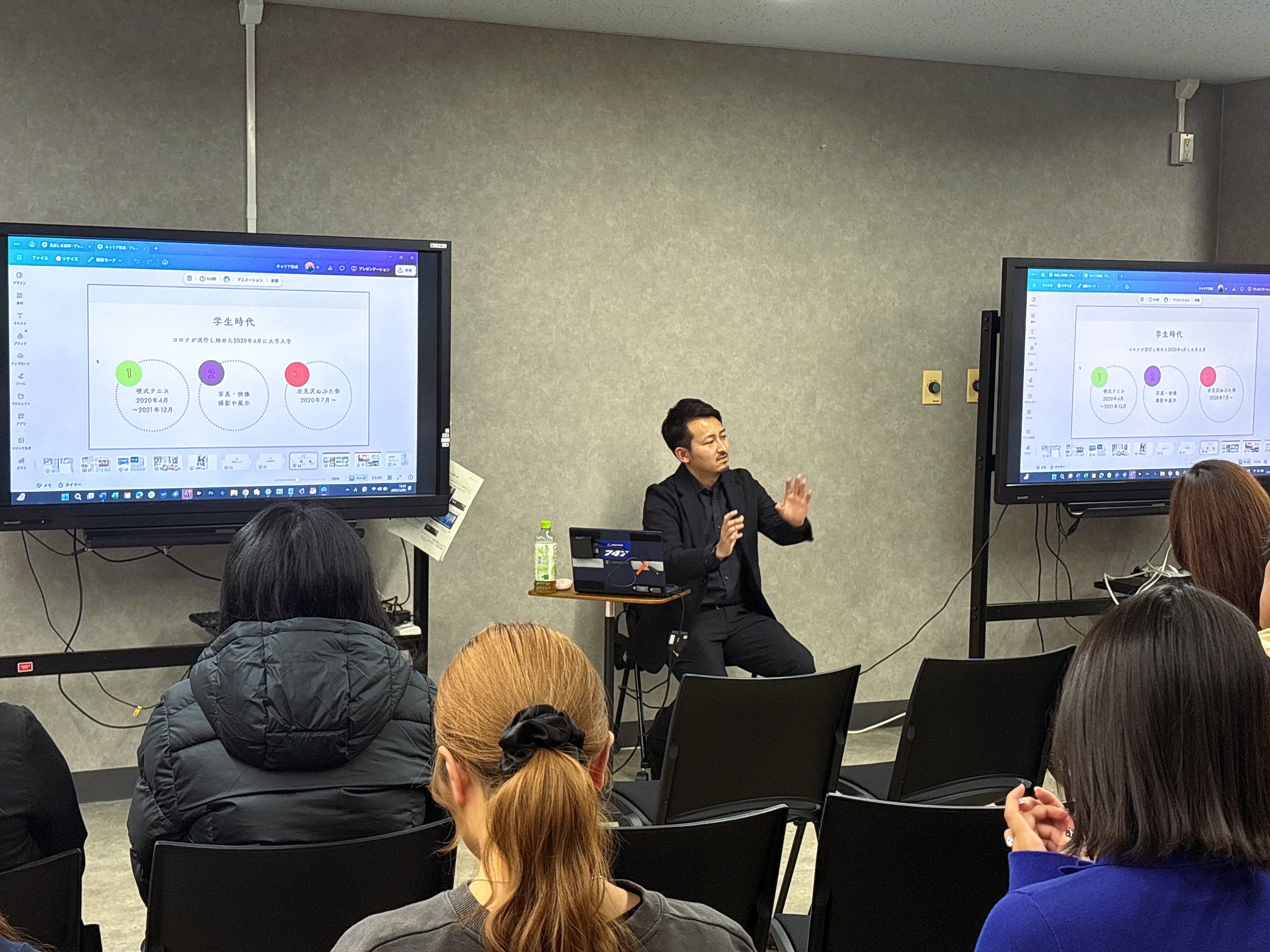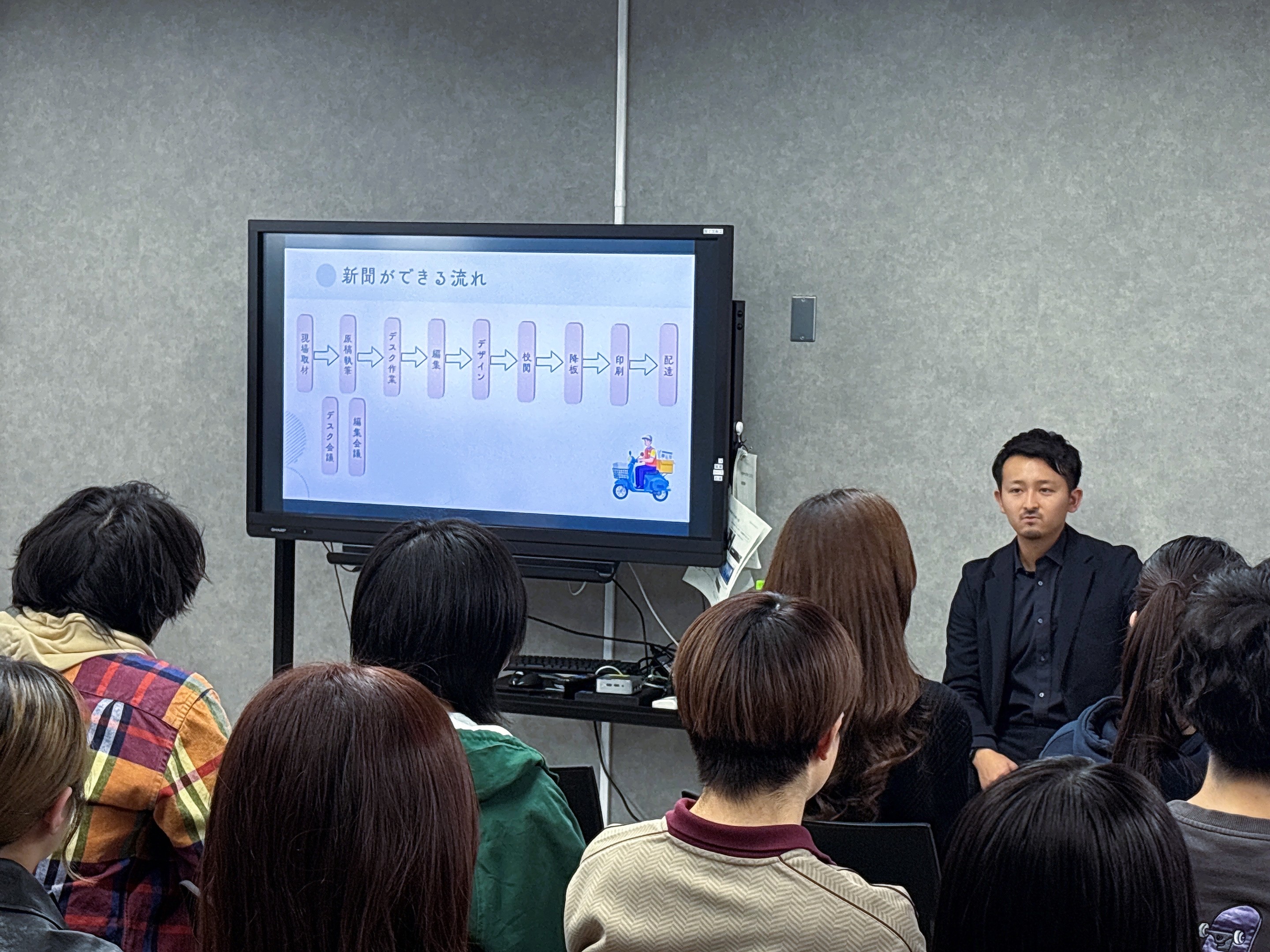 今回は、2023年度に芸術・スポーツビジネス専攻を卒業し、現在は株式会社北海道新聞社の函館支社で報道写真記者として活躍している中島聡一郎先輩を講師にお迎えし、31名の学生が参加しました。