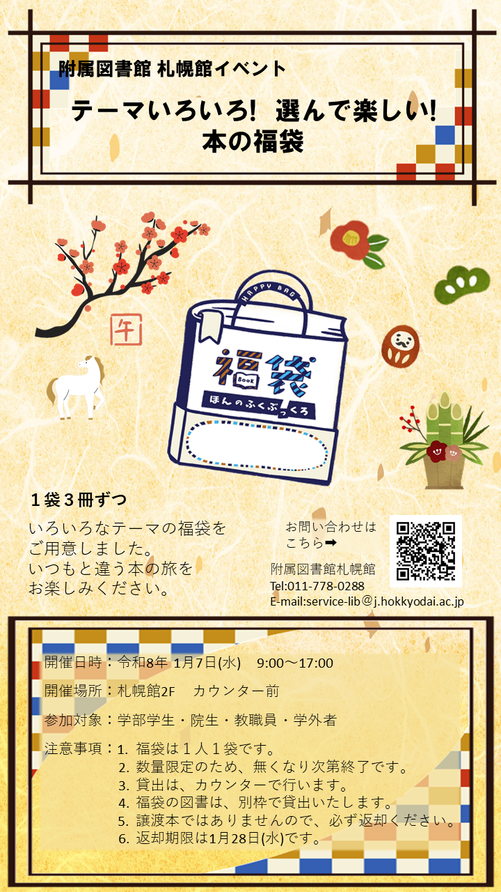 札幌館では、令和8年1月7日(水)に『テーマいろいろ! 選んで楽しい! 本の福袋』を開催します。