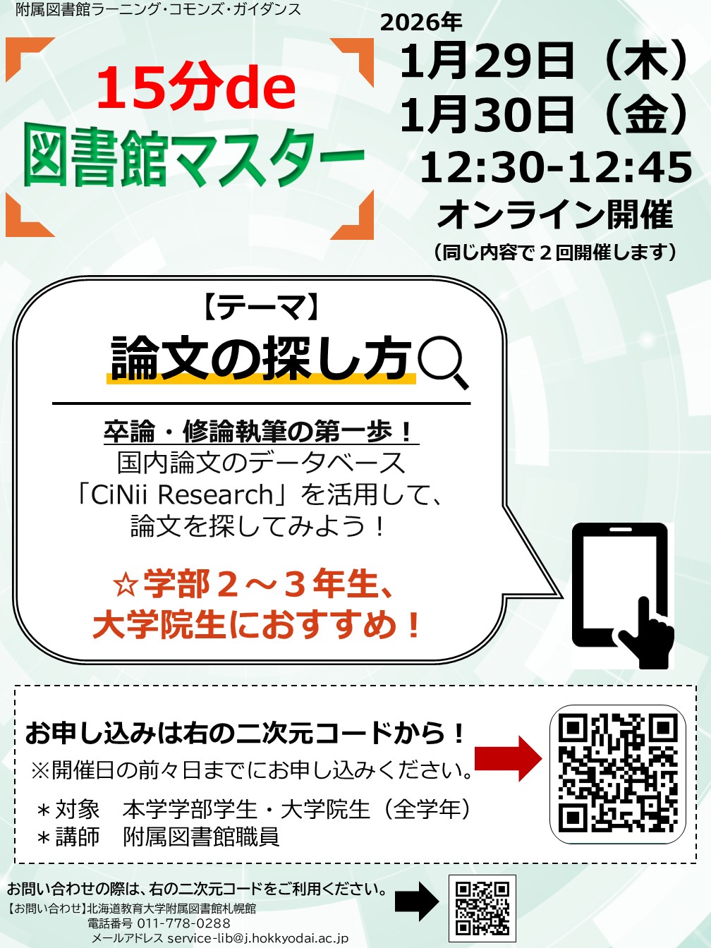 附属図書館では、令和8年1月29日(木)・1月30日(金)に、ラーニング・コモンズ・ガイダンス「15分de図書館マスター【論文の探し方】」をオンラインで開催します。